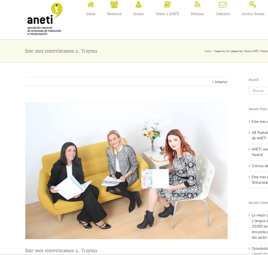 A raíz de su ponencia, desde ANETI nos propusieron hacer una entrevista para conocer mejor a TRAYMA como agencia de traducción especializada en Propiedad Industrial e Intelectual. ¡Y ya os la podemos presentar! Este mes aparecemos en la web de ANETI donde podéis acceder a la entrevista que le hicieron a Verónica González. Allí podréis descubrir detalles sobre el equipo que conformamos TRAYMA y alguna que otra curiosidad, como por qué decidimos especializarnos en Propiedad Industrial e Intelectual.